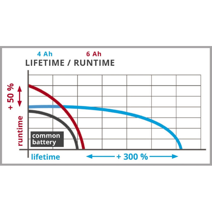 MULTI-Ah технологія: ємність 6 Аг для довшої роботи і ємність 4 Аг для до 3х разів збільшеної кількості циклів заряд/розряд