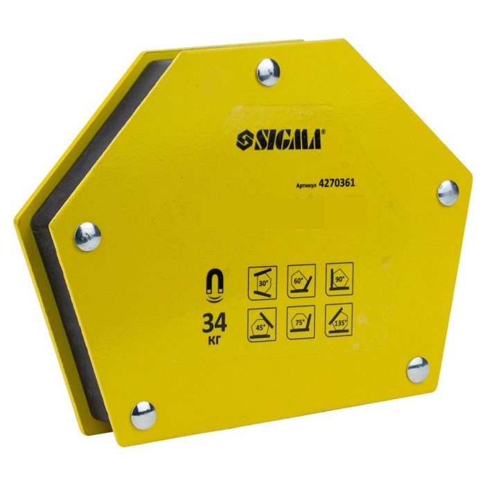 Magnet for welding trapezoid 34kg 105×65×65×45mm (30,45,60,75,90,135°) SIGMA (4270361) is designed for precise fixation of parts at an exposed, correct angle during welding, soldering and other operations during the manufacture of steel metal structures.