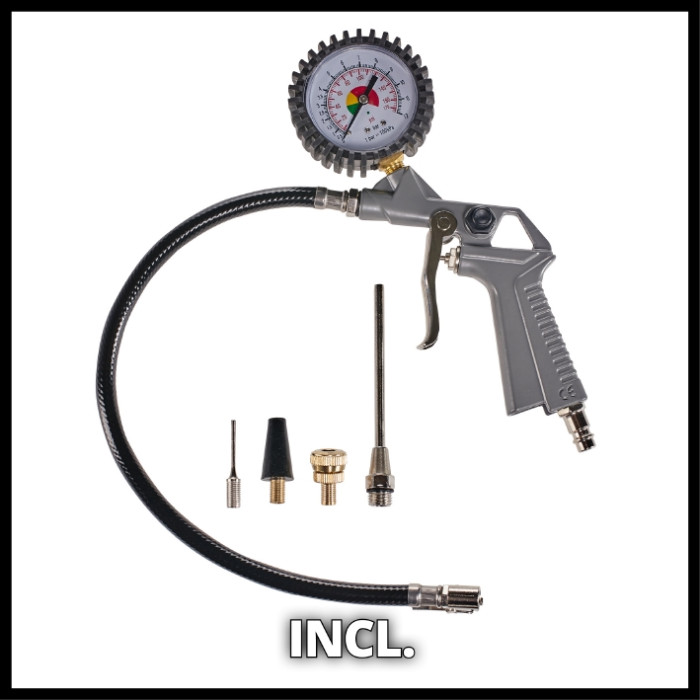 With the Einhell TC-AC 190 OF Set suitcase compressor, you can perform many practical tasks. The powerful air compressor is flat and easy to use, convenient and compact, has a stationary stand for work in the workshop or garage, but also finds its place in the car as a "spare". The compact, practical compressor is ideal as a mobile tire inflator for a car, bicycle or motorcycle or as an "air pump" for summer fun at the lake. The portable compressor can also be used in the workshop, for example in combination with a blow-off nozzle for cleaning work surfaces. The Einhell range offers a wide range of practical compressor accessories. The handy suitcase compressor reaches a maximum pressure of 8 bar and impresses with an oil-free, maintenance-free pump. The compact and lightweight design allows for easy transport. The compressor requires little space for storage. A storage compartment for the hose and blow-off gun is integrated into the housing, as well as an additional storage compartment for adapters. The cable can be wound directly on the housing. The scope of delivery includes a 3-meter compressed air hose with quick-release coupling, a needle for the inflation adapter with tire pressure sensor and a 3-piece adapter set.