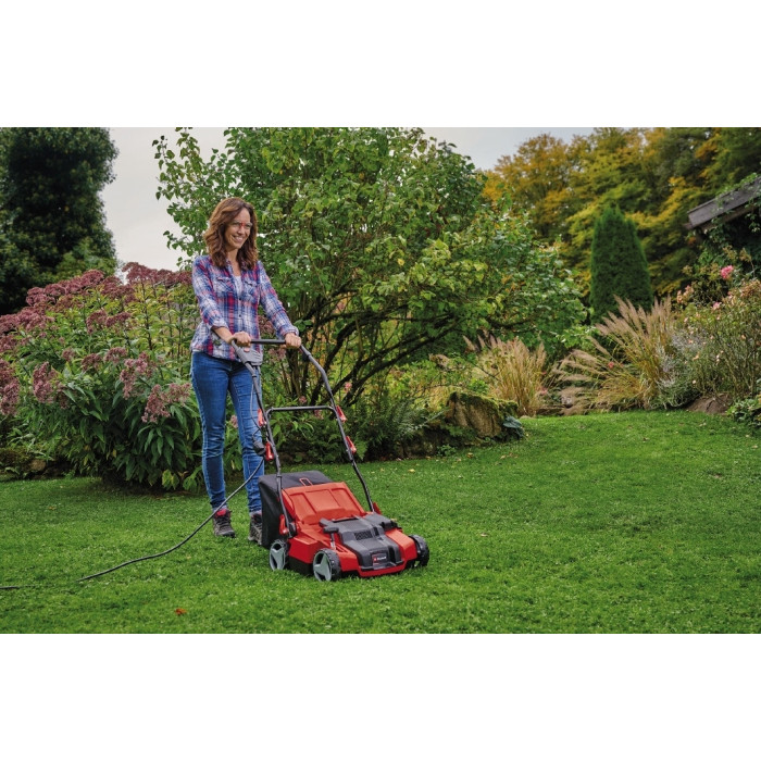Електричний скарифікатор Einhell GE-SA 1435/1 потужністю 1,4 кВт забезпечить пишну та здорову зелень у вашому домашньому саду. Потужний серійний двигун динамічно переміщається до підніжжя повстяного шару та стійкого ґрунтопокривного покриття та забезпечує професійний догляд за газоном. Комбінований пристрій 3 в 1 забезпечує скарифікацію, аерацію та збирання. Під час скарифікації вал із шарикопідшипником врізається в зерно трави за допомогою 16 міцних ножів із нержавіючої сталі та робочою шириною 35 см. Вал аерації з шарикопідшипником довжиною 35 см оснащений 24 списами з нержавіючої сталі. Заміна валу відбувається повністю без інструментів і лише кількома рухами руки. 3-ступеневе центральне регулювання робочої глибини з додатковим транспортним положенням забезпечує комфортну роботу. Складна і регульована по висоті направляюча оснащена важелем швидкого звільнення та має положення для паркування. Крім того, в корпус вбудована ручка для перенесення для зручності транспортування. Великі колеса захищають газон. У великий збірний мішок можна зібрати до 28 літрів зрізаного матеріалу. Корпус із ударостійкого пластику легко чистити та сконструйований таким чином, що його особливо легко обслуговувати.