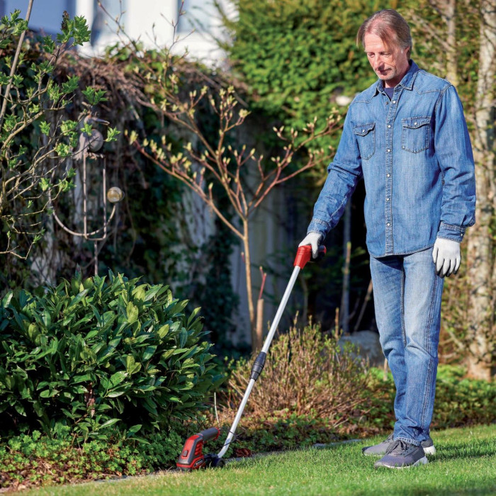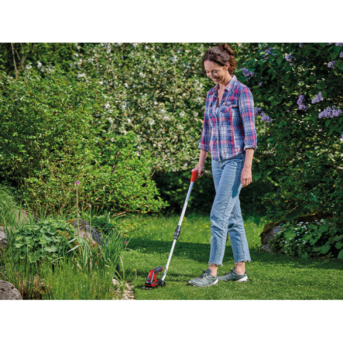 Акумуляторні ножиці для трави та кущів Einhell GC-CG 3.6/70 Li - надійний помічник для точного стриження у вашому домашньому саду. Акумуляторні ножицір підійдуть всім садівникам-любителям, які хочуть не тільки підстригти траву, а й зрізати гілки. Це зручна альтернатива ручним пилкам або садовим ножицям. Перш за все, ножиці для кущів і трави легші, тихіші і пропонують більшу гнучкість, ніж пристрої з бензиновим або електричним приводом, що робить їх ідеальним інструментом для стрижки та формування газону і кущів. Закритий корпус редуктора насадок захищає від контакту з трансмісійним маслом, заміна насадок здійснюється просто і повністю без інструментів одним натисканням кнопки. Насадка для трави з шириною зрізу 70 мм ідеально підходить для догляду за краями газону. Насадка для різання кущів зрізає сучки та гілки товщиною до 8 мм і особливо підходить для догляду за живоплотами та кущами з довжиною різання 110 мм. М’яка рукоятка забезпечує надійне захоплення, тому компактні ножиці зручно тримати навіть під час тривалого використання. В комплект поставки входить телескопічний подовжувач для практичного і зручного використання. Акумуляторна батарея 2,0 Ач встановлена стаціонарно. У комплект входить зарядний кабель для зарядки акумулятора.