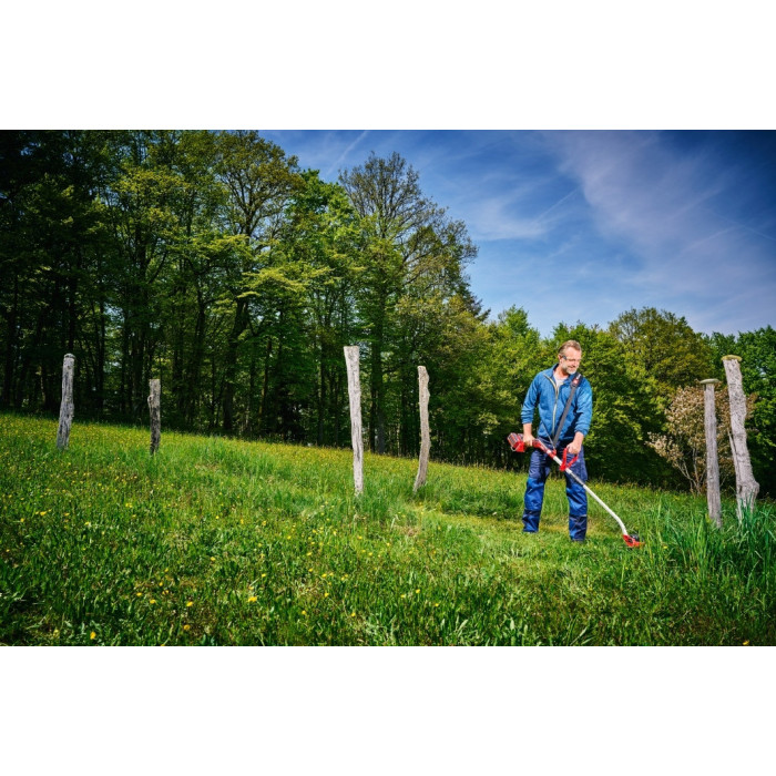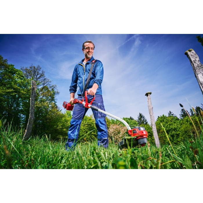 З акумуляторним газонним тримером Einhell Professional GP-CT 36/35 Li BL-Solo кожен садівник має практичного та перевіреного помічника. Підстригаючи крайові смуги чи формуючи газон, акумуляторний тример для газону працює швидко та потужно завдяки 2-ступінчастому контролю швидкості. Тример є інструментом сімейства Power X-Change. Акумулятор можна використовувати в усіх пристроях цієї системної серії. Для роботи акумуляторного тримера для газону потрібні 2 акумулятори 18 В. Пристрій працює від безщіткового двигуна Einhell PurePOWER. Цей безщітковий двигун забезпечує більшу потужність і довший час роботи, ніж звичайні двигуни з вугільними щітками. Подвійно зігнута алюмінієва направляюча штанга забезпечує ідеальний баланс під час роботи. Завдяки роздільній направляючій транспортування зручне, а зберігання заощаджує простір. Регульована додаткова ручка оснащена швидкознімним фіксатором. Волосінь подається автоматично за допомогою механізму автоматичної подачі та забезпечує ширину різання до 35 см. Такі аксесуари, як ремінь для перенесення, роблять акумуляторний тример для газону універсальним і зручним помічником у саду. Захист квітів Flowerguard забезпечує необхідну безпечну відстань до квітів і декоративних рослин і таким чином зберігає гарний вигляд саду. У комплект поставки не входить акумулятор і зарядний пристрій.
