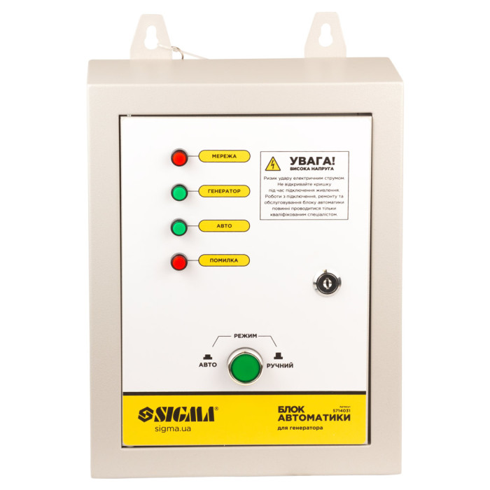 The 220V automation unit for inverter generators up to 10kW SIGMA (5714031) is used for joint operation with generators that have the automatic operation option and a connector for connecting the automation unit is placed on the front panel. The unit provides automatic start of the generator in the event of a failure or interruption of the electricity supply in the common network, switching the load to power from the generator, as well as switching the load back to the common network when the generator is restored and stopped. The automation unit is assembled in a metal case, with wall mounting (indoors). Connection to the generator is made using a special control cable (included) and a power wire (purchased separately). The automation unit must be installed in a dry, weatherproof room.