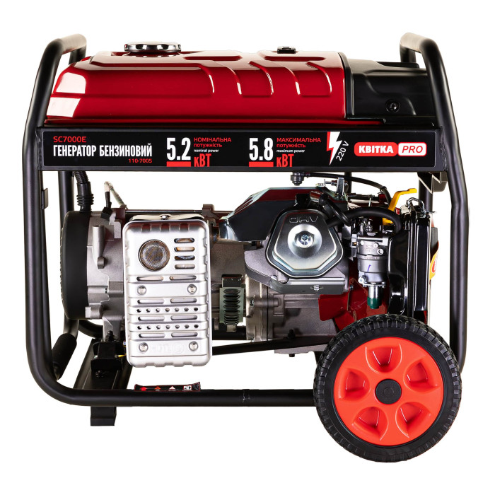 Gasoline generator KVITKA PRO SC7000E — single-phase electric generator with a rated power of 5200 W and a large gas tank with a capacity of 25 liters. Buy a KVITKA PRO SC7000E electric generator to provide electricity to devices during construction or power outages. In addition to manual start, the KVITKA PRO SC7000E gasoline generator is equipped with an electric starter, which makes it possible to start the device even for a child. The KVITKA PRO SC7000E gasoline power station is equipped with a 12 V output, which allows you to connect to charge the battery and other low-voltage devices.