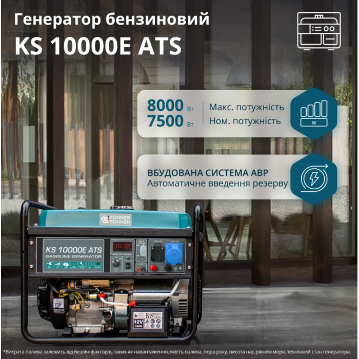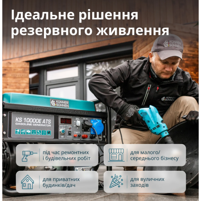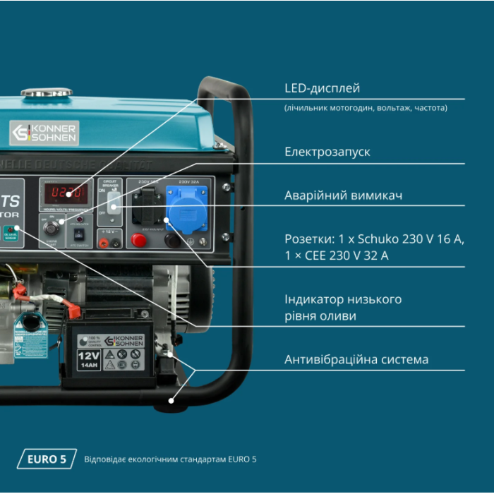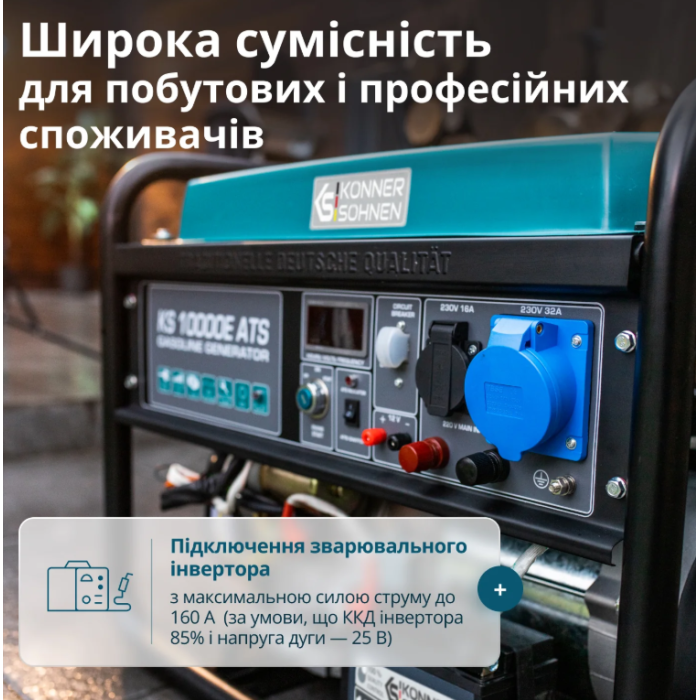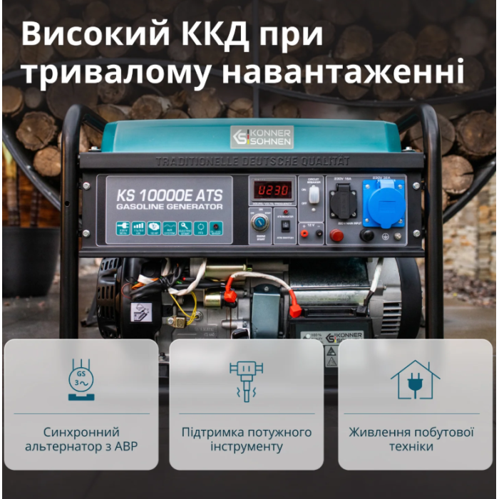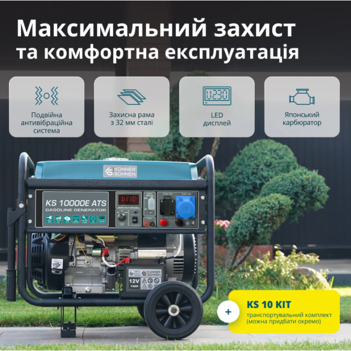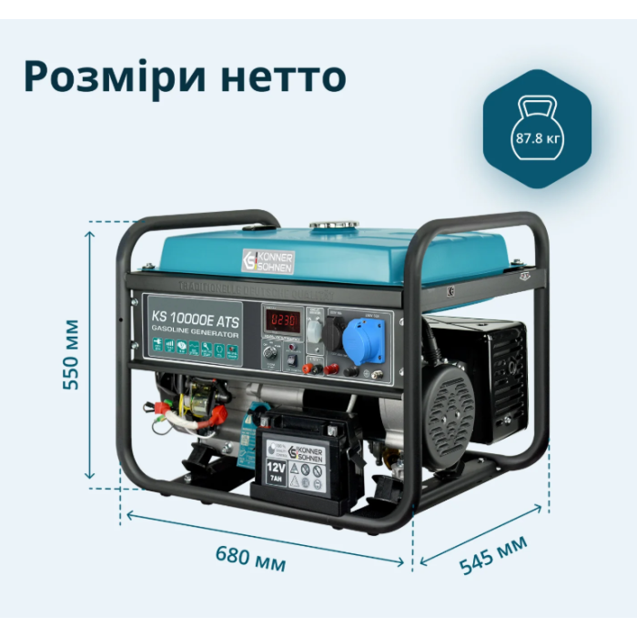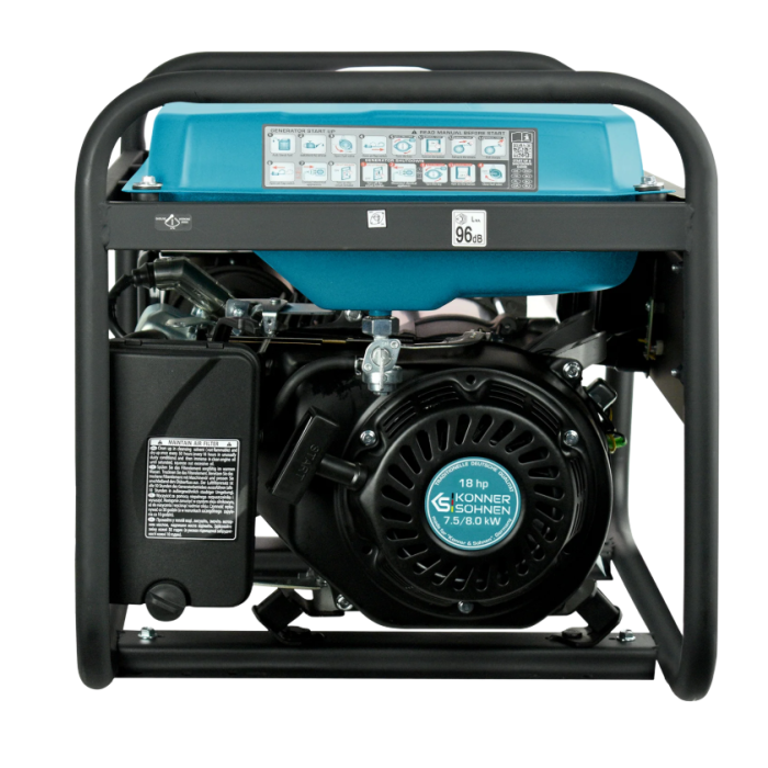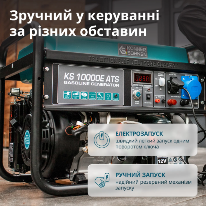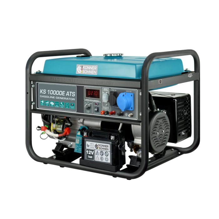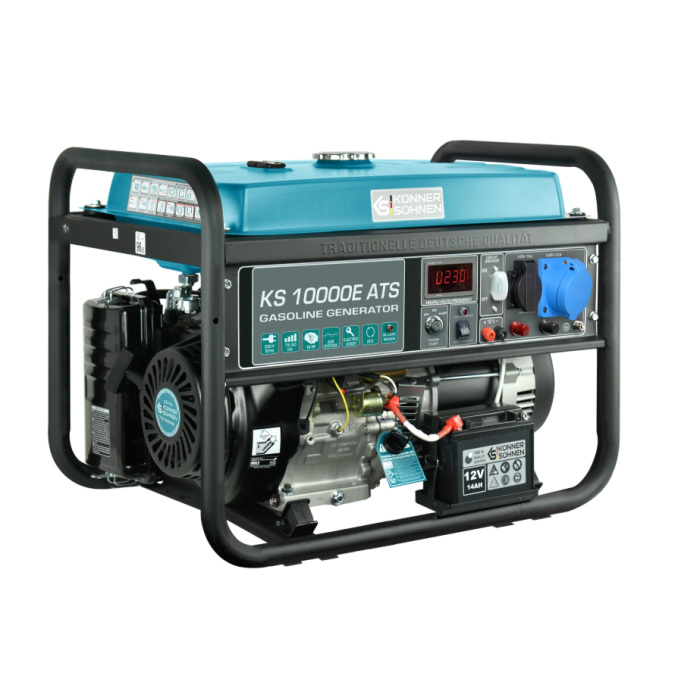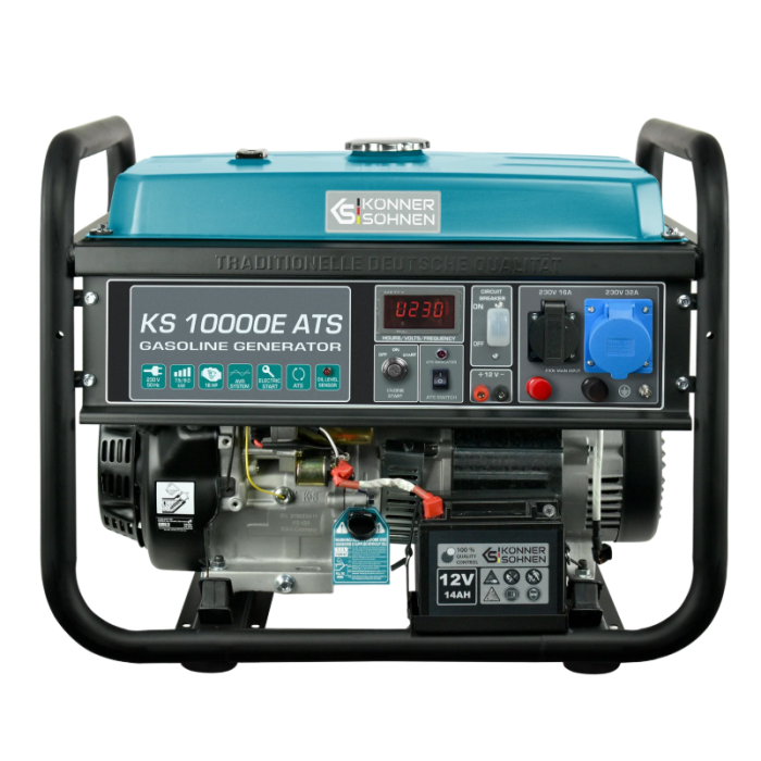 Single-phase generator Konner & Sohnen KS 10000E ATS of the open-type type based on a proprietary 1-cylinder 4-stroke internal combustion engine with a wind cooled volume of 440 cubic centimeters and pressure 18 k.s. The generator initially implements the Automatic Transfer to Reserve (ATS) function, which prevents the automatic start of the generator for any electrical equipment in a stationary environment. The maximum output power, as a standard generator, is 8 kW, the nominal power is 7.5 kW. The generator has one power socket 220V 32A and one standard socket 220V 16A. The power socket is equipped with a sealed plug. Also on the front panel there is a 12V DC output, an oil level indicator and connection terminals to a stationary circuit to implement the ATS function. A richly functional LED display allows you to control the operation of the generator - voltage, frequency, number of working hours. A large 25-liter fire tank ensures continuous operation of the machine. So, at 50% demand and refilling, the hour of continuous operation of the generator becomes 15 years. The generator is equipped with manual and electric start systems, as well as an integrated voltage stabilization system AVR (Automatic Voltage Regulator). Vikonan alternator winding is 100% copper.
