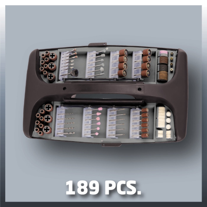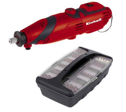 Інструмент для шліфування та гравірування Einhell TC-MG 135 Е являє собою високоякісну компактну машину, яка підходить для величезного числа різних завдань для свердління, різання, шліфування і чищення завдяки широкому асортименту аксесуарів. Блокування шпинделя дозволяє швидко і легко замінювати різні насадки. Електронне регулювання швидкості забезпечує плавний пуск і дозволяє регулювати оберти точно для конкретного завдання. TC-MG 135 Е має гнучкий вал, за допомогою якого можна легко і зручно обробляти різні області оброблюваної деталі. Під час використання інструмент також можна зручно закріпити на телескопічній стойці за відповідний гачок. Завдяки зручній ручці і ергономічному дизайну машина легко утримується в руці. У комплект поставки входить великий комплект аксесуарів для шліфування, свердління, різання і багато іншого зі 189 одиниць, що зберігаються в практичній пластиковій коробці для зберігання і транспортування.