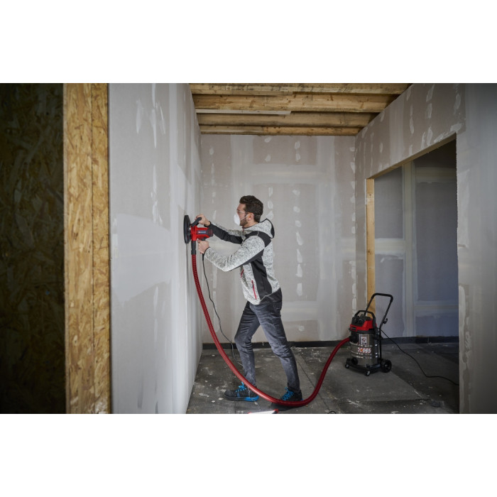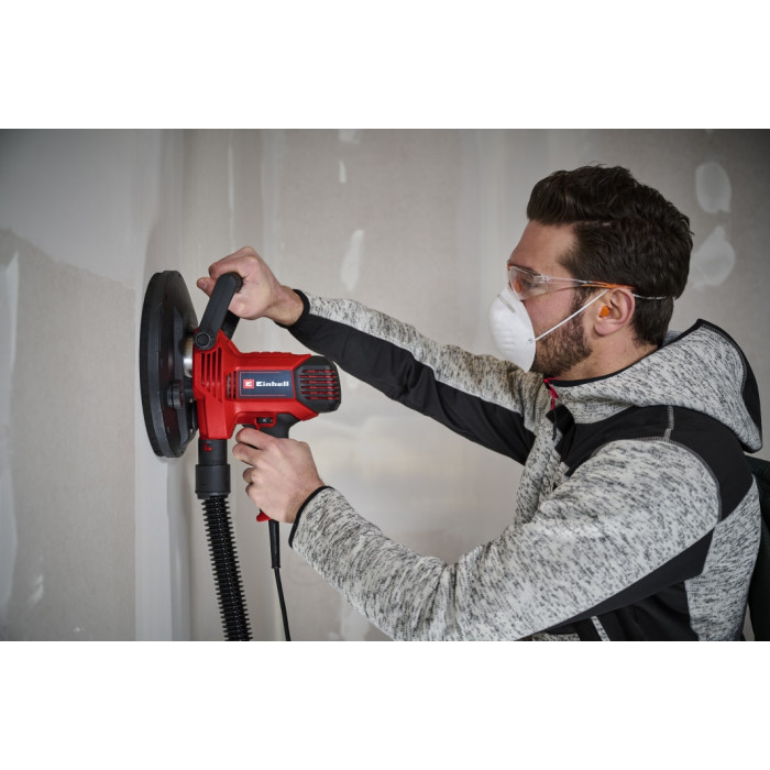 Шліфувальна машина для гіпсокартону Einhell TC-DWS 225 є ідеальним помічником для ремонтних робіт із потужністю 1220 Вт. Кабель живлення довжиною 4 м допомагає відшліфувати гіпсокартонні стіни, шпаклівку або залишки шпалер по всій кімнаті. Залежно від області застосування або матеріалу, обертання шліфувального круга можна регулювати від 1500 до 2300 об/хв за допомогою швидкісної електроніки з функцією плавного старту та перемикача з кнопкою блокування, що забезпечує безперервну роботу пристрою. Завдяки двом рукояткам з м’якими накладками – основній та додатковій – шліфувальна машина для гіпсокартону Einhell добре лежить в руці та забезпечує безпечну та комфортну роботу. Вбудоване відведення пилу забезпечує чисту робочу зону та кріпиться до мішка для збору пилу з ременем для перенесення за допомогою всмоктувального адаптера Ø 35 мм і всмоктувального шланга довжиною 2 м. Край кільця щітки можна зняти з пружинної шліфувальної пластини, забезпечуючи оптимальний контакт зі стіною або стелею. 6 дисків наждачного паперу з різною зернистістю (2x P60, P80, P120) можна легко та швидко прикріпити до шліфувальної пластини за допомогою кріплення-липучки.