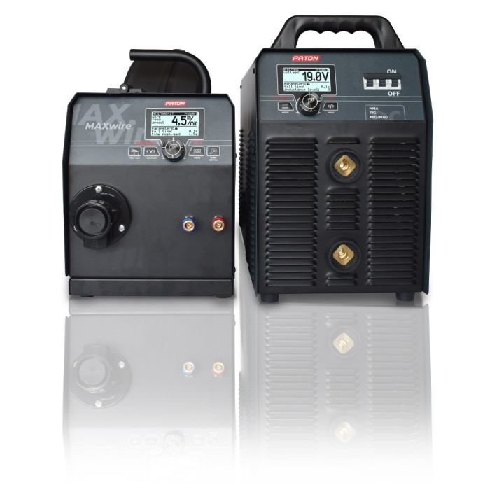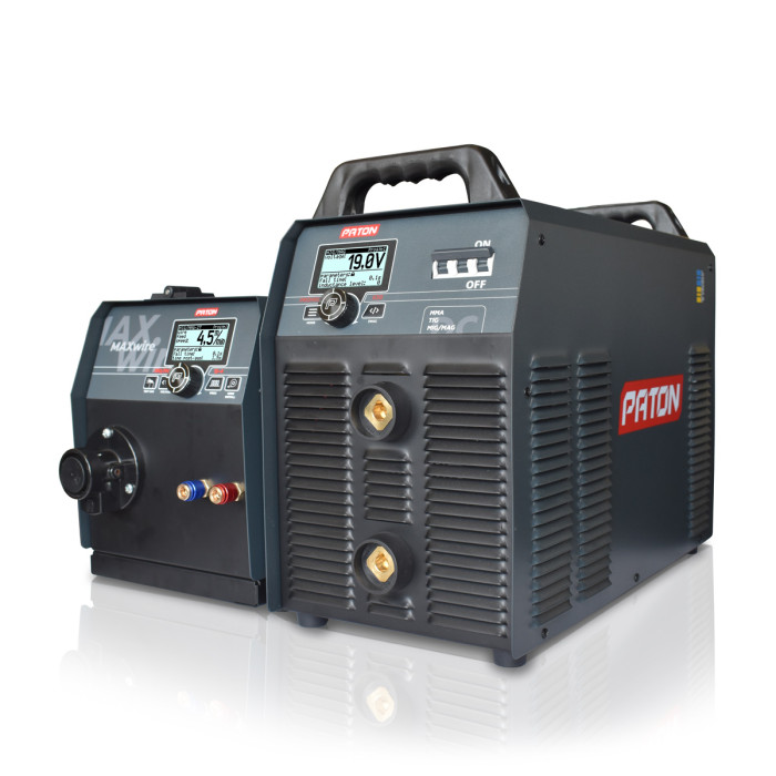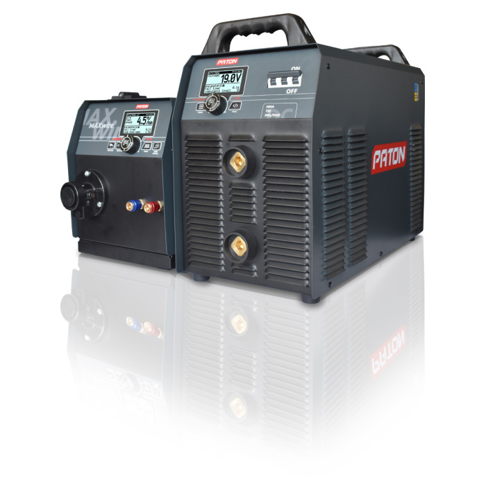 Semi-automatic digital inverter PATON ProMIG-630-15-4-400V W MAXwire is a professional device designed for MIG/MAG welding, MMA and TIG DC welding. The device ProMIG-630-15-4 W MAXwire implemented a fully digital method of control, due to which its multifunctionality and wide possibilities in precise adjustment of welding modes are ensured. Increased load duration on the nominal current up to 630А, allows working with any electrodes with a diameter from 1.6 mm to refractory 8 mm, as well as semi-automatic welding with a solid wire with a diameter from 1.2 to 2.0 mm. Thanks to the double-case design, the current source can be easily separated from the wire-weeding unit, significantly increasing the mobility and convenience of operation in MMA and TIG modes.