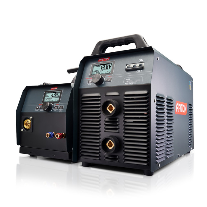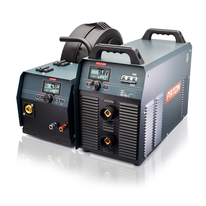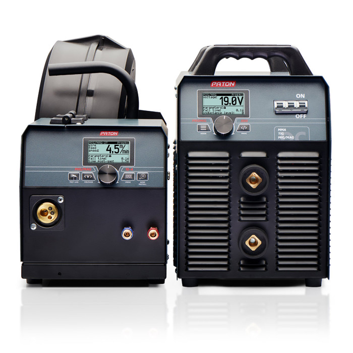 Inverter digital semi-automatic PATON ProMIG-500-15-4 W is a device for professional use, designed for semi-automatic welding (MIG/MAG), manual arc welding (MMA), TIG DC, permanent shaking The device ProMIG-500-15-4 W implemented a fully digital method of control, due to which its multifunctionality and wide possibilities in precise adjustment of welding modes are ensured. Increased load duration on the nominal current up to 500А, allows working with any electrodes with a diameter from 1.6 mm to refractory 6 mm, as well as semi-automatic welding with a solid wire with a diameter from 0.6 to 1.6 mm. Thanks to two-hull execution, the current source can be easily separated from the wire supply unit, which significantly increases the mobility and convenience of operation in MMA and TIG modes. The welding semi-automatic machine is equipped with two more connectors for connecting a liquid cooling hose and a cable with power contacts.