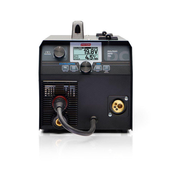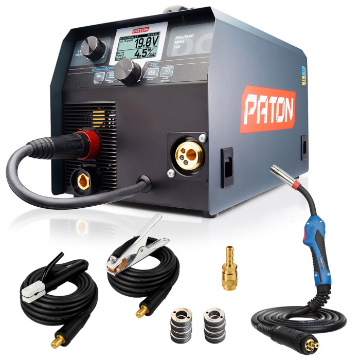PATON StandardMIG-200 equipped with a high-quality metal wire feeder with a strong hermetic motor, a universal connector KZ-2 type "EURO" allows connecting welding torch from a wide range of manufacturers. StandardMIG-200, in conjunction with high power and capacity, has a low weight and dimensions. And thanks to the LCD screen machine is easy and convenient to set up a solution to any problem. The device comes with high-quality accessories from the company ABICOR BINZEL, which allow you to immediately start work in MIG/MAG and MMA modes.