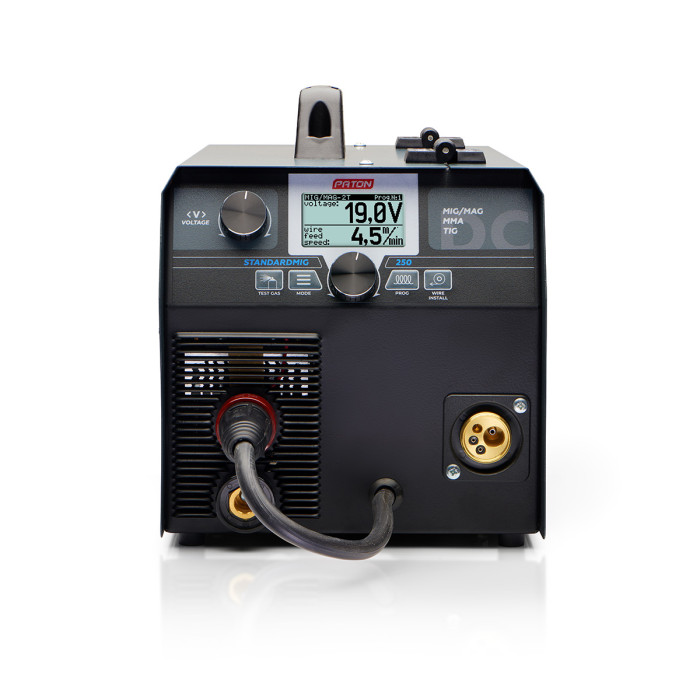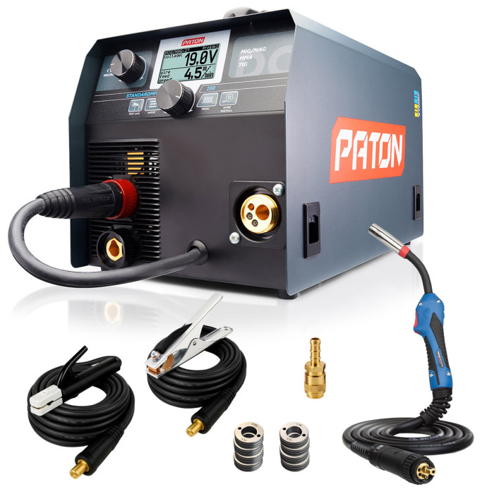 PATON StandardMIG-250 equipped with a high-quality metal wire feeder with a strong hermetic motor, a universal connector KZ-2 type "EURO" allows connecting welding torch from a wide range of manufacturers. StandardMIG-250, in conjunction with high power and capacity, has a low weight and dimensions. And thanks to the LCD screen machine is easy and convenient to set up a solution to any problem. The device comes with high-quality accessories from the company ABICOR BINZEL, which allow you to immediately start work in MIG/MAG and MMA modes.
