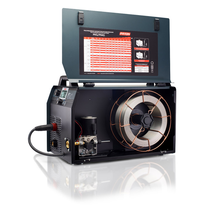 Digital semiautomatic inverter PATON StandardMIG-270 - is intended for semi-automatic welding (MIG/MAG), manual arc welding (MMA), TIG on a direct current in a medium and shielding gas mixtures. The device StandardMIG-270 is implemented fully digital way to manage, thereby ensuring its versatility and ample opportunity to fine tune the welding conditions. Issue unit 270A to the rated current, enables any working electrodes with diameters from 1.6 mm to 6 mm (including refractory) and a solid welding wire with diameters from 0.6 mm to 1.2 mm. Separate closed compartment for welding wire improves its protection against dust and other contaminants, as well as its construction involves the installation of the wire coils weighing up to 15 kg.
