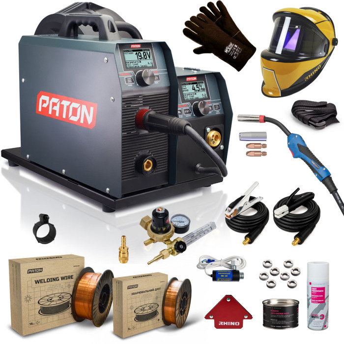 PATON ProMIG-350-15-4 welding set is a specially selected set for safe and comfortable welding, designed for professional use in MMA та MIG/MAG welding modes. The kit includes high-quality personal protective equipment (mask, leggings), a set of welding cables, a semi-automatic torch, and consumables for MIG/MAG welding.