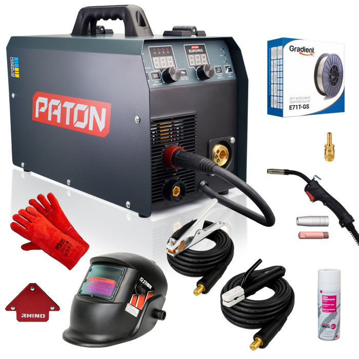 PATON EuroMIG LITE welding set is a specially selected set for safe and comfortable semi-automatic welding (MIG/MAG), manual arc welding (MMA). The kit includes high-quality personal protective equipment (mask, leggings), flux-cored wire, a set of welding cables, a semi-automatic torch, and consumables for MIG/MAG welding.