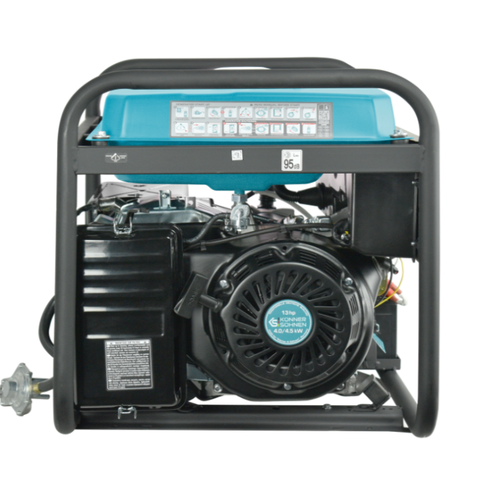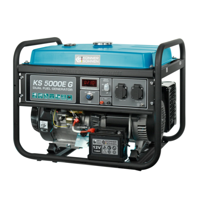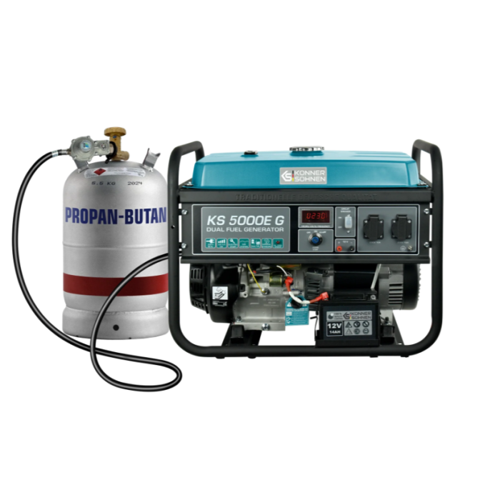 Газобензинові генератори ТМ «Könner & Söhnen» серії DUAL FUEL на сьогоднішній день найбільш популярні серед покупців через свою економічність та екологічність. Ви можете використовувати генератор як на бензині, так і на зрідженому газі (пропан-бутан). Експлуатація генератора на газу підвищує моторесурс двигуна. Все необхідне для підключення балону йде в комплекті: генератор оснащений регулятором нульового тиску, шлангом з понижуючим редуктором; необхідно тільки під’єднати генератор до Вашого газового балону. Генератор не призначений для підключення до газової магістралі. При необхідності газобензинові моделі легко перемкнути на роботу на бензині. Потужний одноциліндровий 4-х тактний двигун K&S з повітряним охолодженням забезпечує стабільну та надійну роботу генератора.