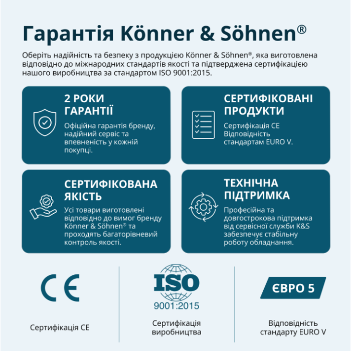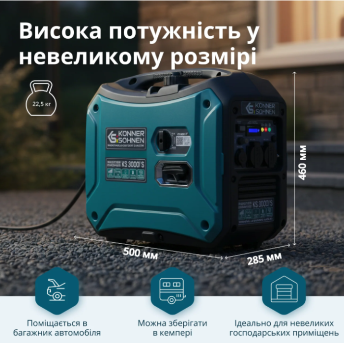 KS 3000i S забезпечує потужну, але тиху роботу в компактному корпусі вагою лише 22.5 кг. Завдяки піковій потужності 3.3 кВт він ідеально підходить для кемпінгу, виїзних заходів та аварійного резервного живлення у будинку. Рівень шуму лише ~68 дБ дозволяє використовувати його без дискомфорту для оточення. Інверторна технологія з чистою синусоїдою гарантує безпечне живлення ноутбуків, телевізорів та іншої електроніки, а режим Eco-Mode оптимізує витрати топлива та забезпечує до 4 годин роботи на одному баку об'ємом 4 л. Завдяки двом розеткам 230В і виходу 12В цей портативний генератор є универсальним, надійним і відповідає суворим стандартам Eurо 5.