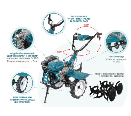| Комплектація | Культиватор, Інструкція, Пакування, 32×Фрези, Сошник, Кронштейн стояночної опори, Кожух трансмісії, Консоль, 2×Захисні крила, Панель керування, 2×Низькопрофільні безкамерні колеса 4.00-8″, Набір інструментів |