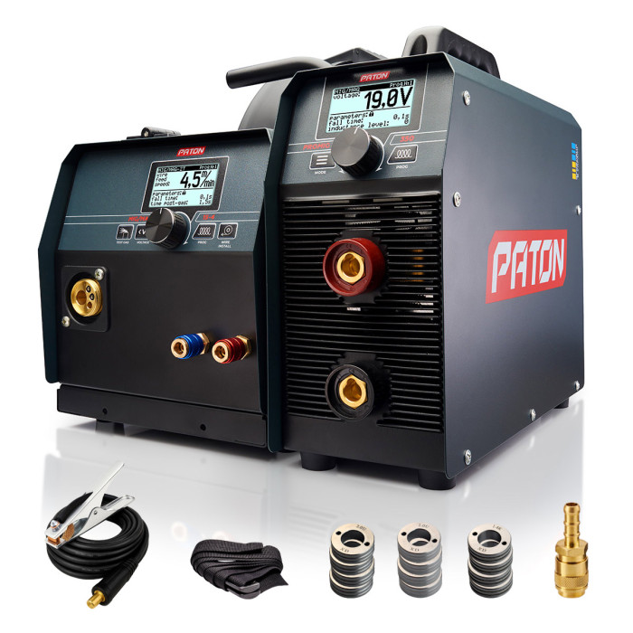 Інверторний цифровий напівавтомат PATON ProMIG-350-15-4 W - це апарат для професійного використання, призначений для напівавтоматичного зварювання (НА «MIG / MAG»), ручного дугового зварювання (РДЗ «MMA»), аргонодугового зварювання (АРГ «TIG»), постійним струмом, в середовищі захисних газів і сумішей. В апараті ProMIG-350-15-4 W реалізований повністю цифровий спосіб управління, за рахунок чого забезпечуються його багатофункціональність і широкі можливості в точному налаштуванні режимів зварювання. Підвищений показник тривалості навантаження на номінальному струмі до 350А, дозволяє працювати будь-якими електродами діаметром від 1,6 мм до 6 мм, а також напівавтоматичне зварювання суцільним дротом діаметром від 0,6 до 1,4 мм. Завдяки двокорпусному виконанню, джерело струму можна з легкістю відокремити від блоку подачі дроту, що значно підвищує мобільність і зручність роботи в режимах MMA і TIG. Зварювальний напівавтомат оснащений ще двома роз’ємами для підключення шлангу рідинного охолодження та кабелю із силовими контактами.